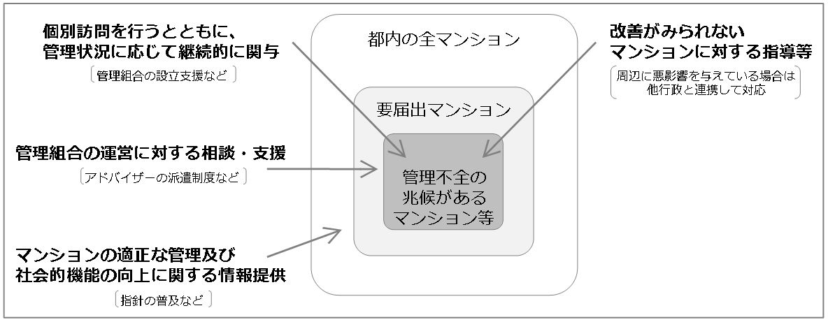 - 管理組合が、都又は区市町村の行うマンションの適正な管理を促進する施策に対応し、又は協力する必要があるときは、当該管理組合に対し、必要な支援を行うよう努める