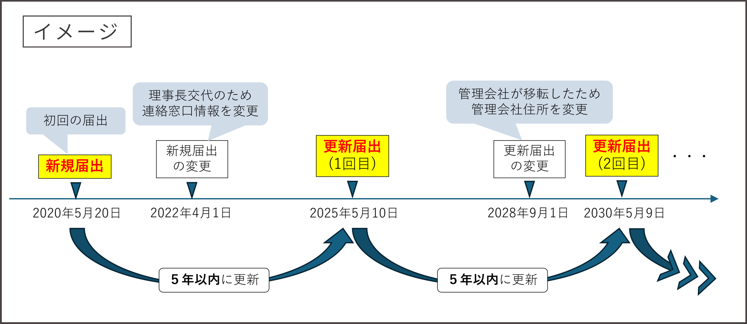 *前回の新規届出または更新届出から5年以内に更新を届け出てください。