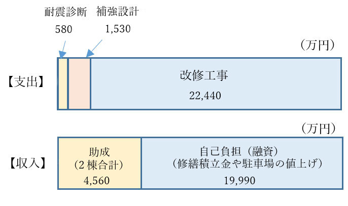 理事長)N棟とS棟をあわせて、耐震診断費、補強設計費、改修工事費で約2億4千万円かかりました。