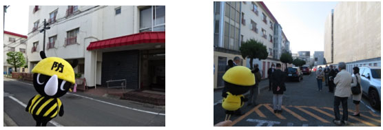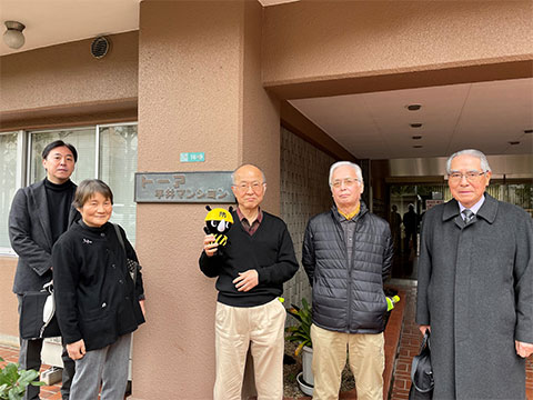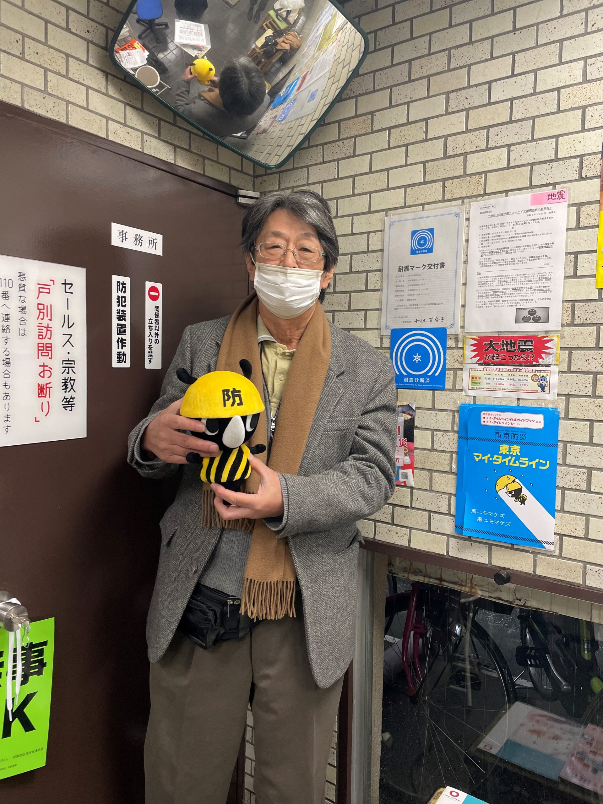 東京防災公式キャラクターの防サイくんと、昨年度に耐震改修工事を実施した「ファミール三軒茶屋」を訪問しました。