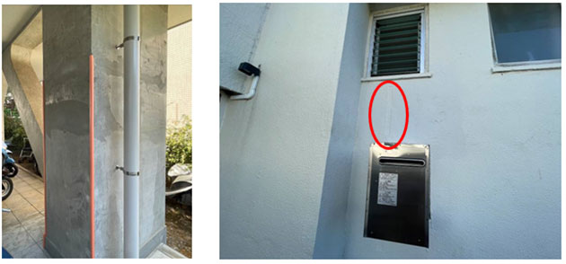主な工事内容として、3号棟 西棟では階段室の2階と5階の窓を閉塞、4号棟では外廊下側に5~7階にかけて外付け鉄骨ブレース補強と7~10階で耐震スリットを新設しました。 また、耐震改修に伴い、補強部分と排気口が干渉する箇所があり、一部工事変更がありましたが、適切に対処しました。