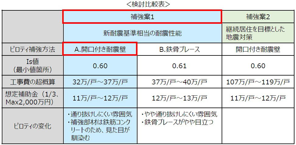 補強案として、住みながらの施工、経済性を踏まえ、複数案を提示しました。