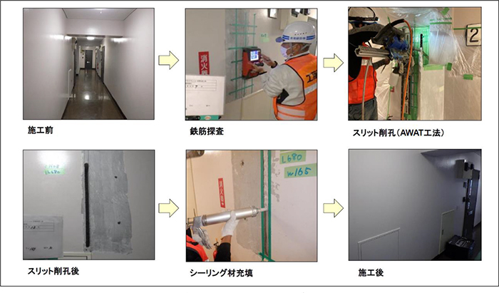 耐震スリットを内廊下や外壁に新設するとともに、開口付き耐震壁を1階駐輪場のピロティ部分に新設しました。なお、耐震スリットは、内廊下での施工になるため、騒音や粉塵が低減できる工法で施工しました。