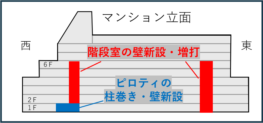 マンションは長方形の平面形状で、東西に1か所ずつ階段室があるため、これらを利用して耐震補強を計画しました(下図)。診断の結果、2階と6階が耐震性不足でしたが、全体のバランスを考慮して1階から6階までを補強することにしました。西側の1階はピロティとなっているため、柱の鋼板巻きと壁の新設を行いました。西側階段室の2階から6階と、東側階段室の1階から6階は壁の新設・増打による補強を行いました。