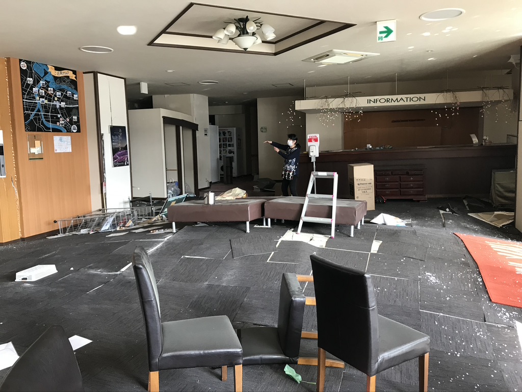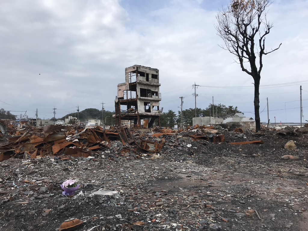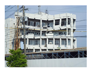 これが典型的な壊れ方の1つです。それ以外にも市内のあちこちで、中間のある階だけが壊れた建物や、足元が壊れて全体が転倒し前面道路をふさいでしまった建物、また溶接部が破断して大きく傾いた鉄骨造の建物など、様々な被害が見られました。